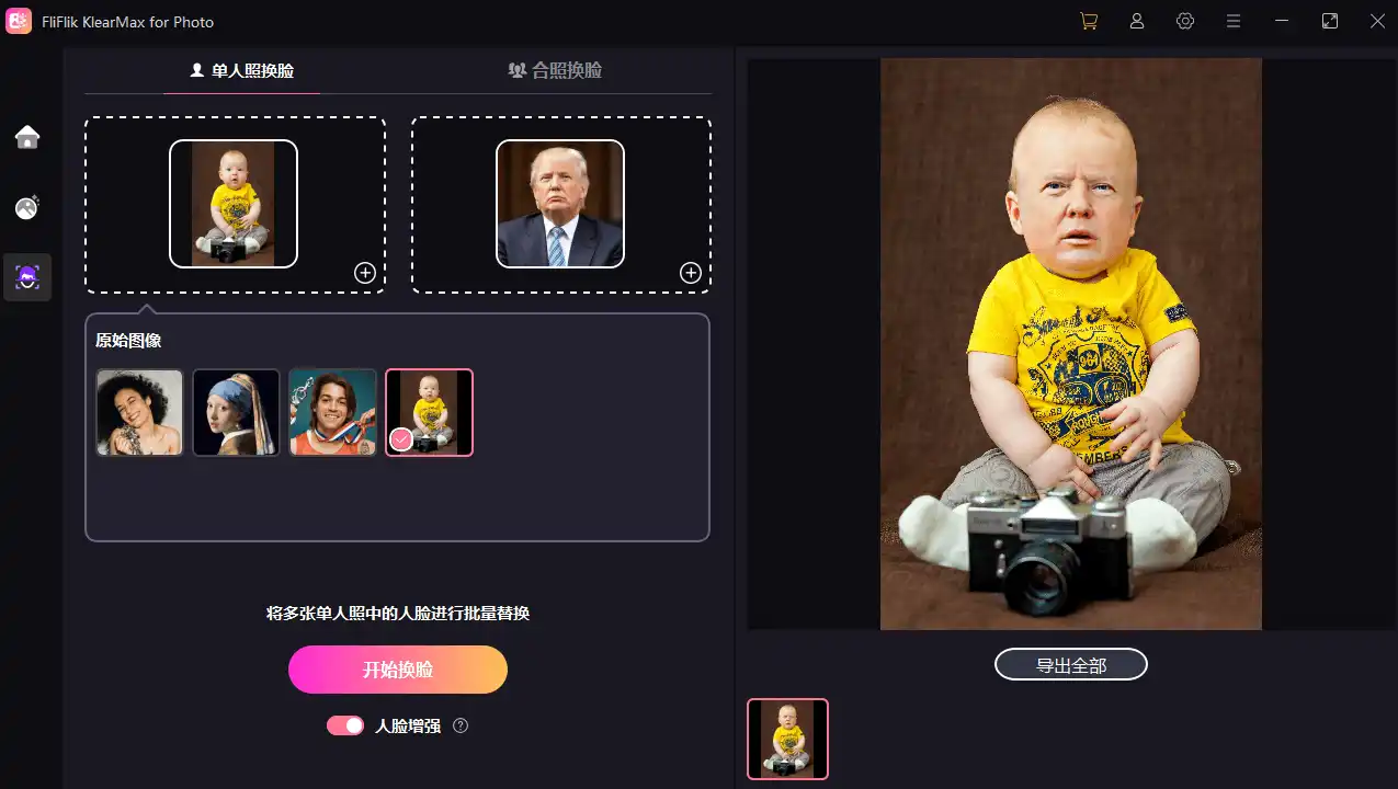• AI换脸功能:新增的AI换脸功能支持单人照和合照换脸,操作简单快捷。