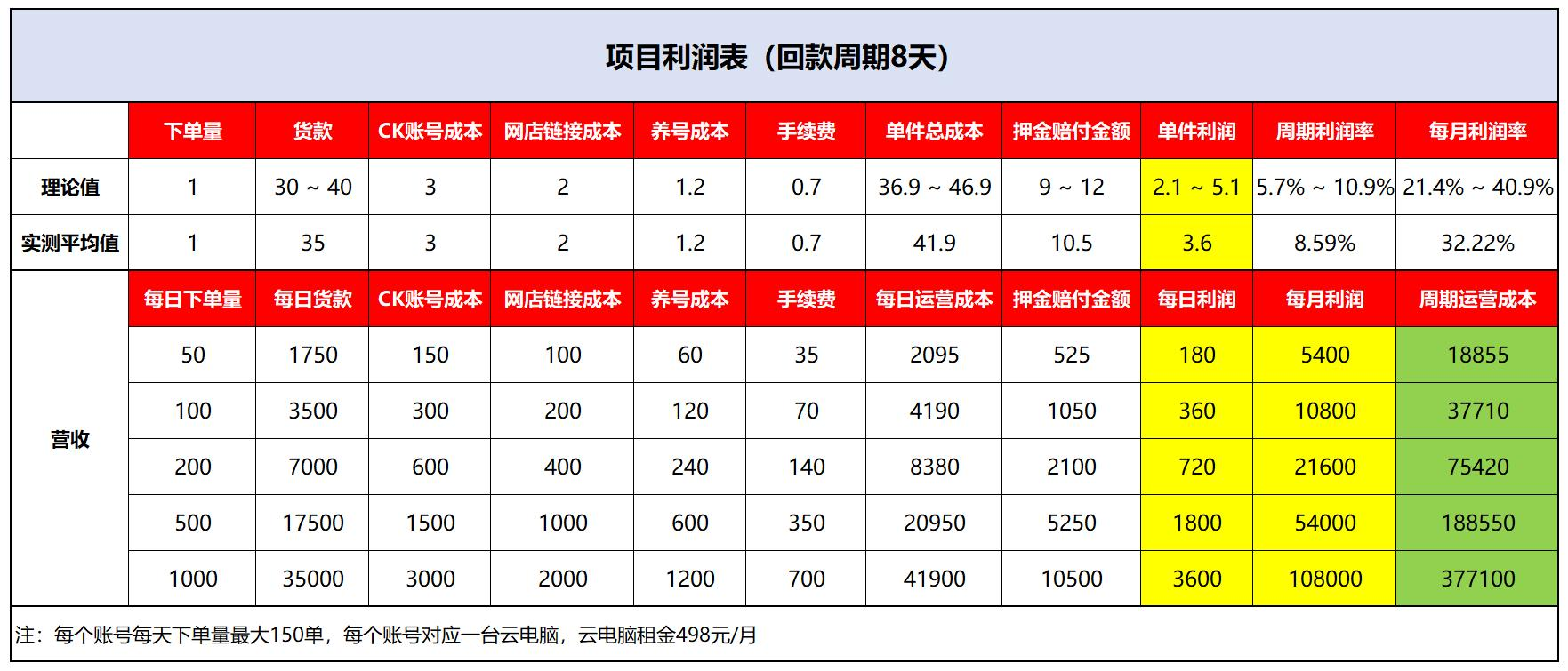 目前下单的商品价格是在 30 至 40 之间,加上租号购买店铺链接等成本 ,平 均一单所需资金是 43 左右 ,赔付是 9 至 12 ,除去租号购买店铺链接这些成本, 一单到手的纯利润是 3 至 5 块。