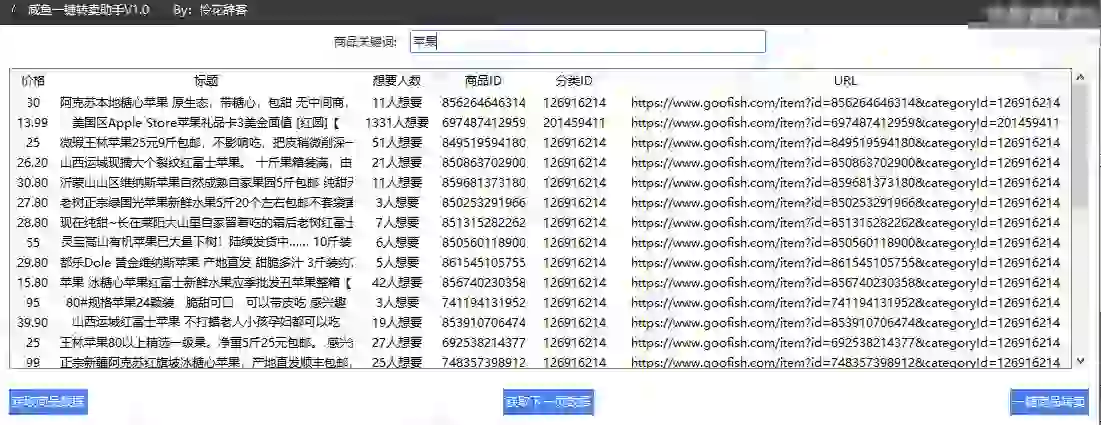 - 商品信息获取:通过输入关键词,从闲鱼平台获取相关商品信息,并展示在表格中。