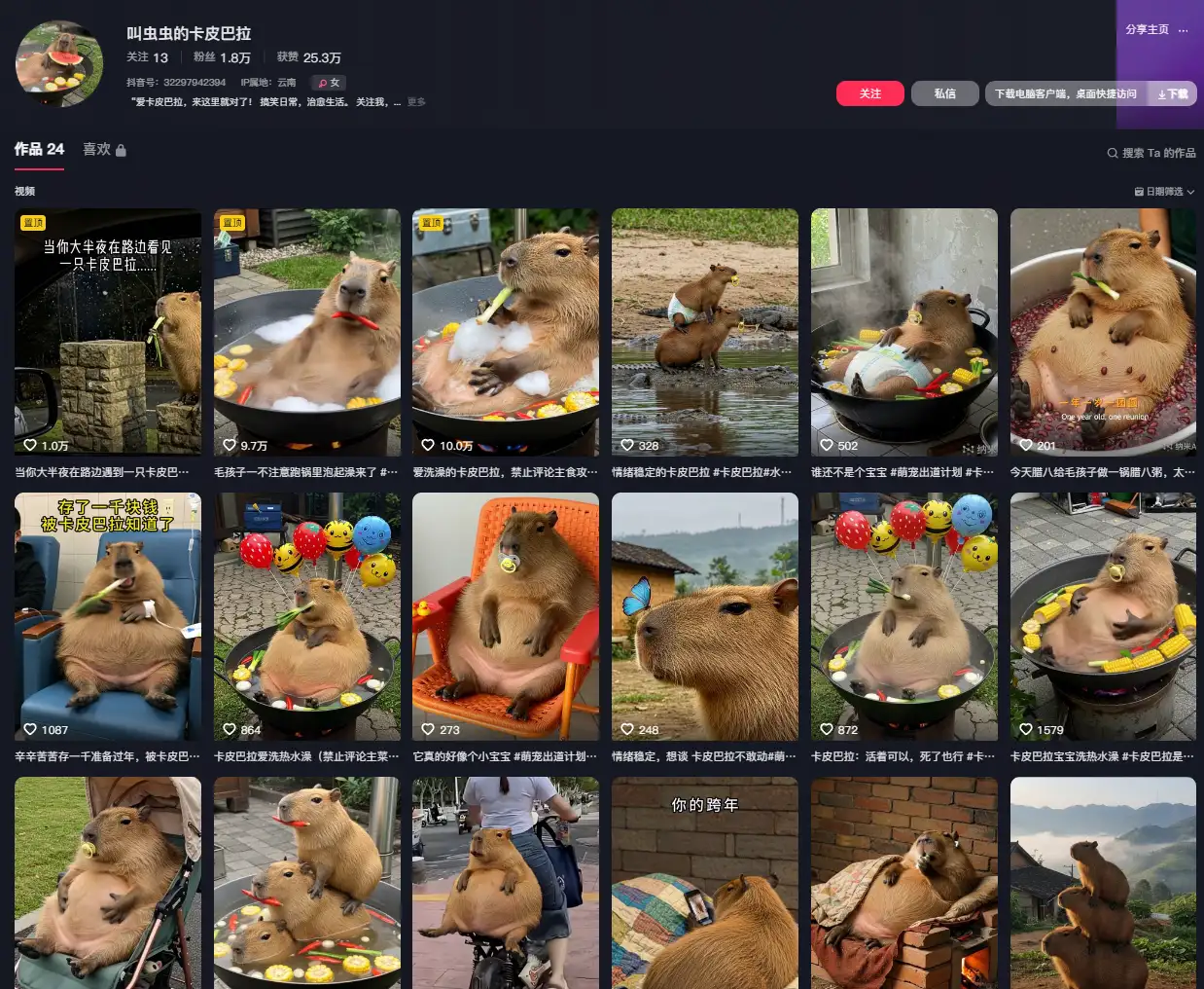 我最初是在小红书刷到视频,发现“A1+萌宠”这个赛道真的是火到不行不行!从“肥啾“到“孔雀”,再到“兔子”,到现在的新晋霸主水豚,热度完全没降过!做萌宠赛道的小伙伴们可以跟着这种趋势走,真的是可以打造一个“动物园了,哈哈哈~
