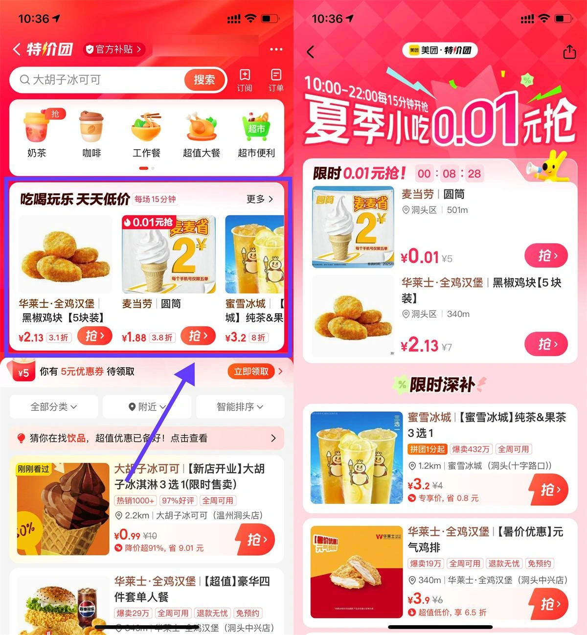 • 美团搜索“特价团”->吃喝玩乐天天低价->每15分钟有0.01亓美食或奶茶(部分人没有入口)