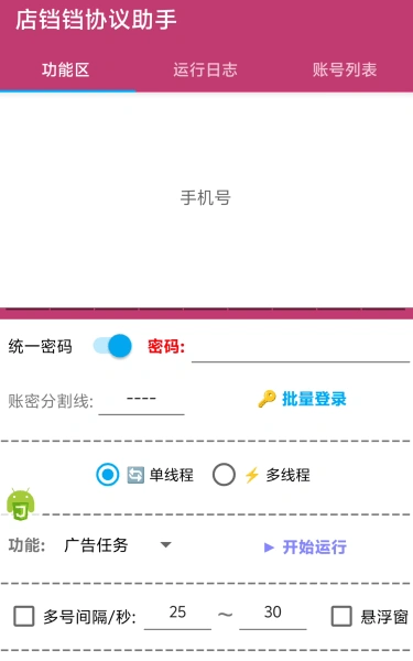 • 账号密码登陆,支持批量账号同时挂机,登陆后点开始运行即可(小白协议软件无脑操作)